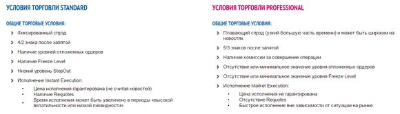 Тип счета PROFESSIONAL предполагает плавающий спред от 0,5 пунктов, плечо до 1:100 и технологию исполнения Market Execution, то есть, с выводом позиций на межбанковский рынок. Сразу отметим, что при отсутствии необходимой ликвидности дилер может отклонять ордера или увеличивать время исполнения. Единственным преимуществом данного счета является рыночное исполнение сделок без вмешательства компании, что обеспечивает отсутствие конфликта интересов. Тем не менее, рекомендовать данный торговый счет для серьезной торговли мы также не можем, особенно трейдерам, которые предпочитают скальпинг и различных торговых советников – при столь расширенных спредах и небольшом кредитном плече остается надеяться только на ручную классическую торговлю.