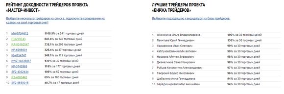 Сервис «БИРЖА ТРЕЙДЕРОВ», который предполагает передачу торгового счета инвестора в управление опытному трейдеру на основании специального Соглашения между двумя сторонами (аналог доверительного управления). Для этого также представлен рейтинг наиболее успешных кандидатур, среди которых инвестор может выбрать самый подходящий вариант. Таким образом, все операции на счете инвестора будут осуществляться управляющим трейдером, которому с прибыли инвестора будет отчисляться до 50% в качестве вознаграждения.