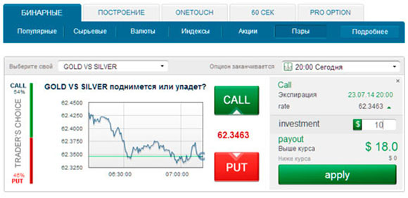 Отличительная черта брокера – парные опционы. Например, вырастет ли серебро к золоту или нет?