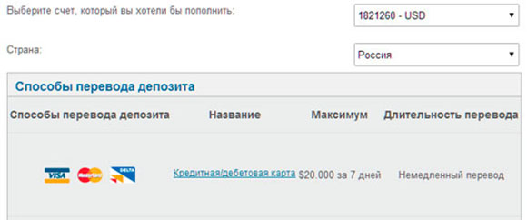 Брокер предлагает вводить и выводить средства с использованием разных платёжных средств. Например, дебетовых и кредитных карт, которые популярны по всему миру, а также используется платёжная система WebMoney, которая имеет очень большую популярность во всем мири.. Чтобы начать торговать с таким брокером, вам нужно будет пополнить свой счёт всего на 10 долларов, евро или британских фунтов. Хотя официально минимальный депозит в 10 раз больше. Впоследствии изменить валюту счёта будет уже нельзя. Минимальный лот, то есть стоимость одного опциона, составляет тоже 10$.