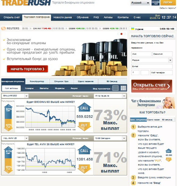Интерфейс ресурса максимально доступен восприятию, новым пользователям требуется минимум времени для адаптации. Официальный сайт TradeRush.com переведен на несколько языков (включая русский) и является комплексной платформой, включающей: