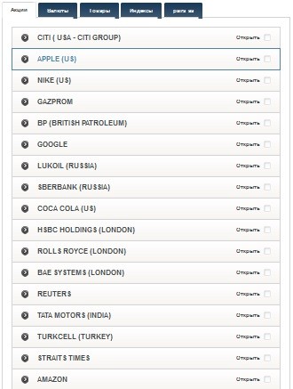 - Ценные бумаги. В разделе представлен довольно внушительный список акций крупнейших компаний мира, есть также акции ряда российских предприятий.