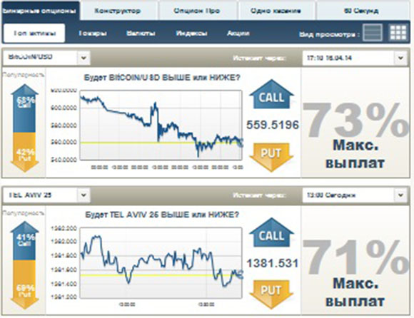 Одним из основных преимуществ брокера является ассортимент базовых активов, лежащих в основе опционных контрактов - всего около 200 активов. Это дает возможность каждому из трейдеров, чувствующему себя наиболее комфортно в работе с определенным сегментом рыночных инструментов, найти возможность для проведения прибыльной сделки.