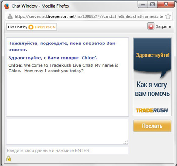 Для связи с представителями ТрейдРаш предлагается использовать телефон – для жителей большинства стран есть «горячие» внутренние номера. Для оперативной связи предусмотрен онлайн-чат, а если вопрос не является срочным – можно воспользоваться формой обратной связи или же электронной почтой.