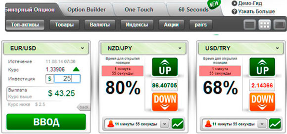 Брокер предлагает несколько вариантов опционов - опционы типа Call/Put, а также One Touch и 60-секундные опционы для тех, кто предпочитает быстро получать прибыль. Также есть конструктор опционов. Если вы используете его, то сами задаёте все параметры. В частности, время исполнения опциона от 5 минут до 24 часов, а также стоимость.
