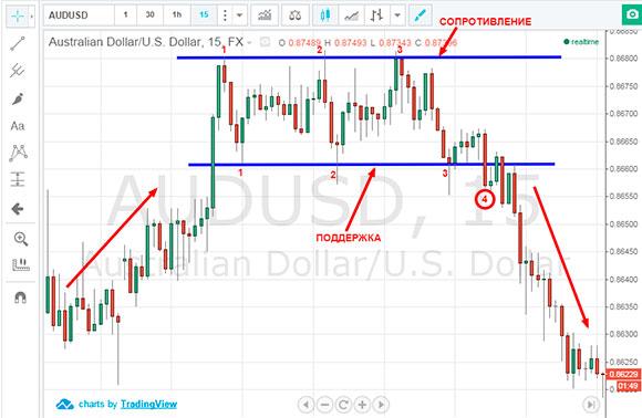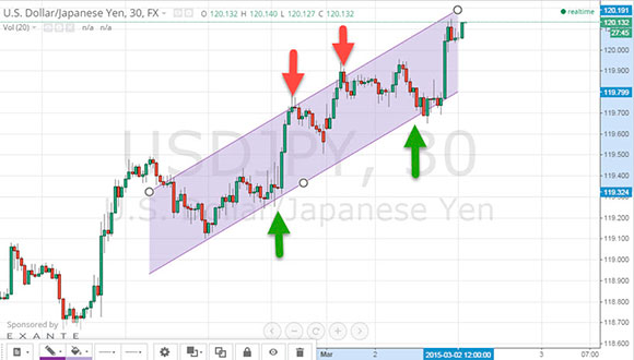 Данная стратегия позволяет зарабатывать в момент, когда тренд отсутствует, и цена движется в горизонтальном канале, который условно ограничен линиями поддержки и сопротивления. Если цена приблизилась к верхней части канала, можно открывать сделку на продажу, и наоборот, покупка у нижней границы может принести прибыль.