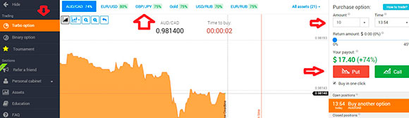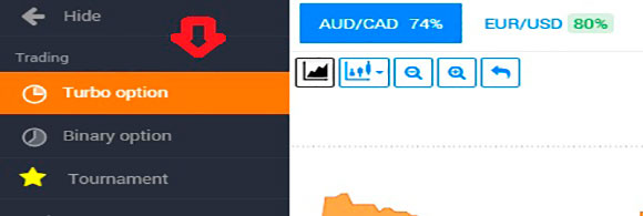 Затем, зайдя под своей учетной записью, необходимо перейти в раздел, где находится торговая платформа. В соответствующем разделе платформы нужно выбрать вид контракта (в данном случае нас интересуют turbo option).