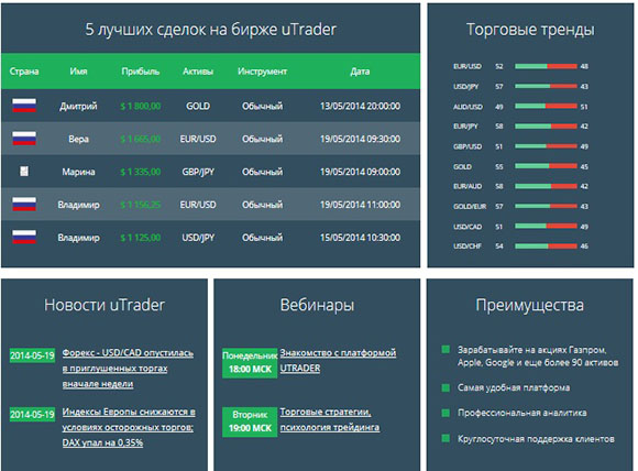 Внешний вид главной страницы официального сайта uTrader.com несколько отличается от того, что обычно предстает перед глазами посетителей сайтов других брокеров. Нет, сайт не перегружен рекламой, однако создается впечатление, что разработчики постарались разместить на главной странице как можно больше информации. Возможно, причиной тому – ориентированность ресурса на пользователей мобильных устройств.