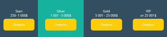 Для открытия счета Start необходимо пополнить счет на 200$, очередная ступень Silver (250 - 1 000$) далее - Gold (1 001 - 5 000$), и, наконец, VIP (от 25 001$).