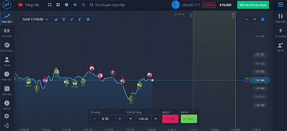 Tài khoản demo ExpertOption có thể được thiết lập mà không cần phải đăng ký trên nền tảng này. Tài khoản demo cung cấp 10.000 đô la tiền ảo để bạn có thể sử dụng và thử nghiệm nền tảng cũng như các chiến lược giao dịch khác nhau.