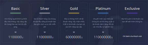 Tài khoản bạc yêu cầu một khoản tiền nạp tối thiểu 250 đô la. Bạn sẽ có được một người quản lý cá nhân, 2 buổi đào tạo cá nhân, báo cáo phân tích kinh tế hàng tuần và 80% tiền thưởng.