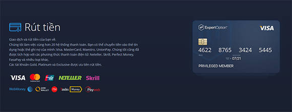 Quy trình nạp tiền trên ExpertOption nhanh chóng và đơn giản thông qua thẻ ghi nợ và thẻ tín dụng cùng với các hình thức thanh toán khác như Skrill và Neteller.
