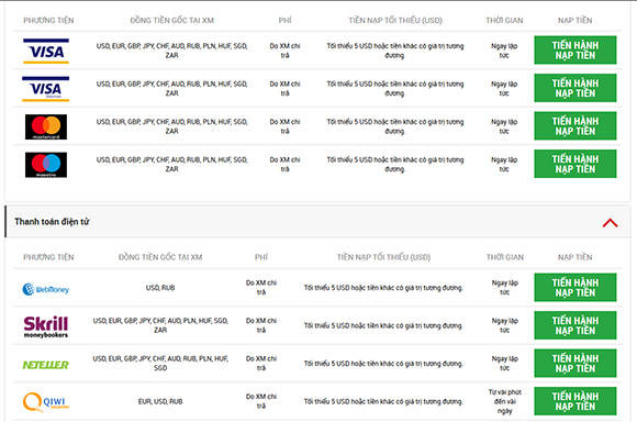Việc nạp và rút tiền được thực hiện dễ dàng trên XM.com do nhiều phương thức giao dịch khác nhau được cung cấp cho các nhà giao dịch. Bạn có thể nạp tiền với các phương thức sau: