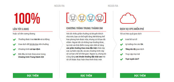 Công ty cung cấp 100% tiền thưởng với giá trị lên tới 5000 đô la cho tất cả các khoản tiền ký quỹ mới. Đây là một ưu đãi giới hạn. Nhà môi giới này cũng cung cấp Chương trình khách hàng thân thiết XM, nơi các nhà giao dịch có thể kiếm được phần thưởng tiền mặt và tiền thưởng tín dụng.