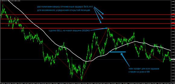 Фокус данной стратегии в том, что индикатор ZigZag рисует каждую новую вершину с обеих сторон мувинга МА, благодаря чему можно при появлении каждой новой нарисованной вершины, входить в рынок в направлении мувинга. Таким образом, правильно управляя открытыми сделками, можно каждую из них завершать положительным результатом.
